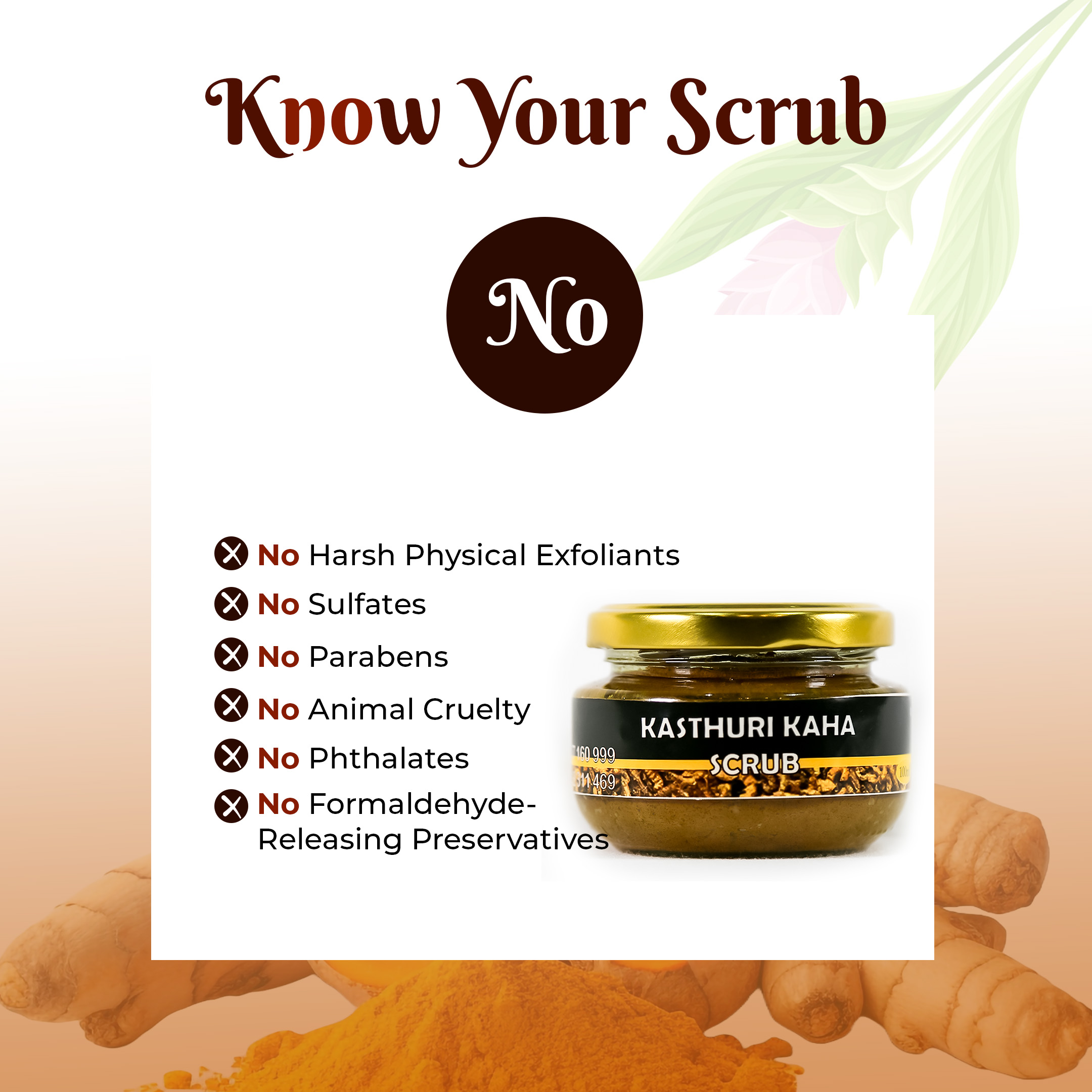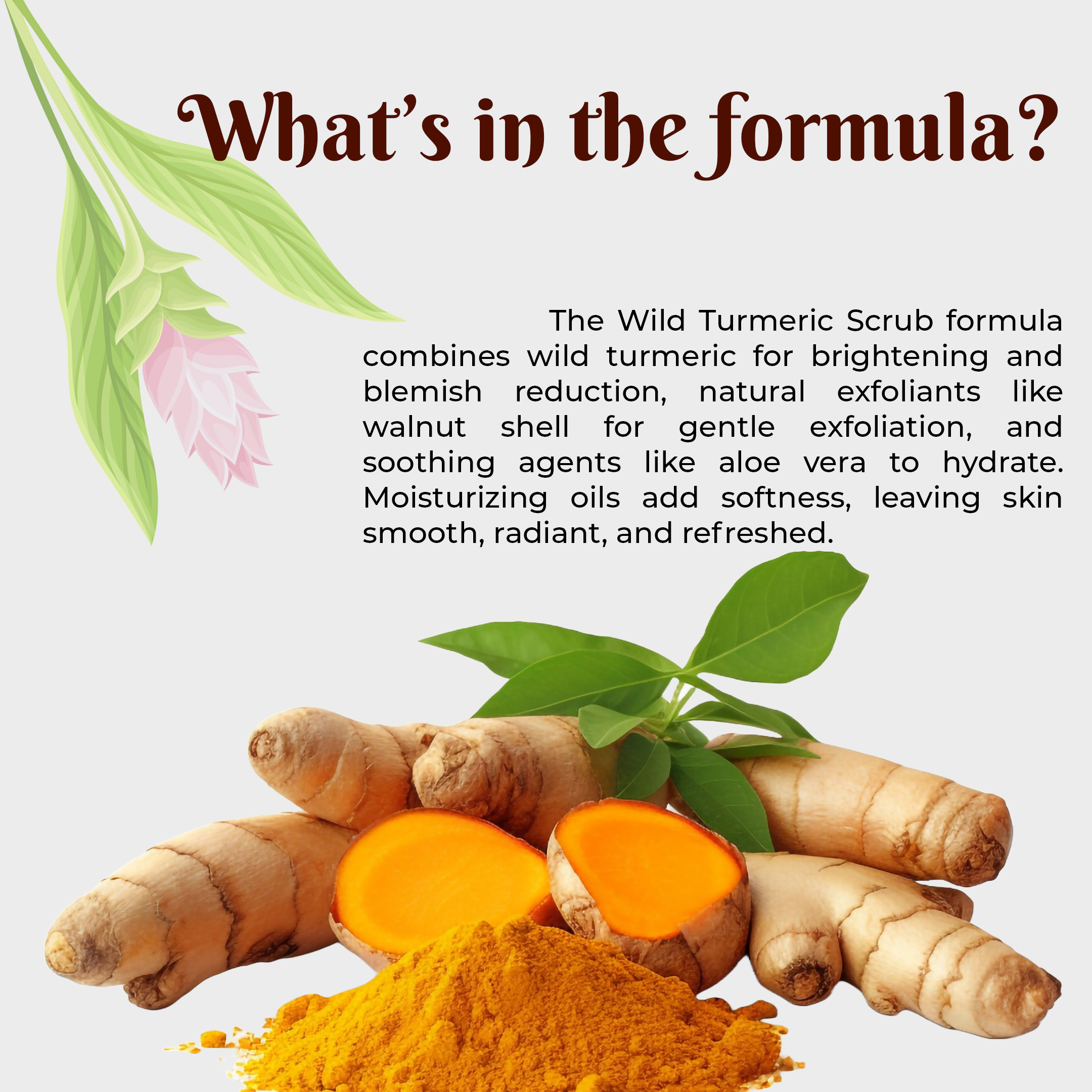 The Wild Turmeric Scrub formula combines wild turmeric for brightening and blemish reduction, natural exfoliants like walnut shell for gentle exfoliation, and soothing agents like aloe vera to hydrate. Moisturizing oils add softness, leaving skin smooth, radiant, and refreshed.