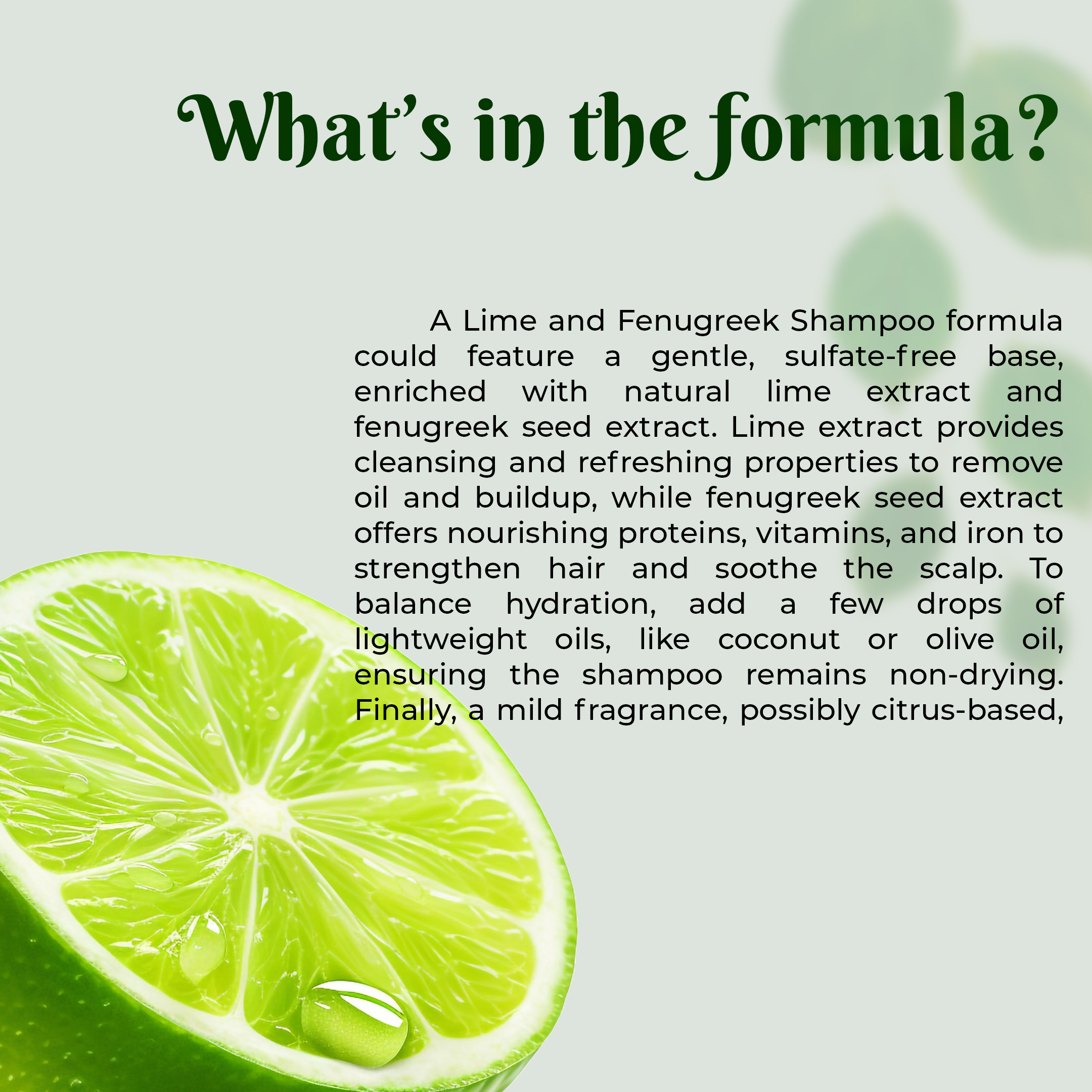 A Lime and Fenugreek Shampoo formula could feature a gentle, sulfate-free base, enriched with natural lime extract and fenugreek seed extract. Lime extract provides cleansing and refreshing properties to remove oil and buildup, while fenugreek seed extract offers nourishing proteins, vitamins, and iron to strengthen hair and soothe the scalp. To balance hydration, add a few drops of lightweight oils, like coconut or olive oil, ensuring the shampoo remains non-drying. Finally, a mild fragrance, possibly citrus-based.